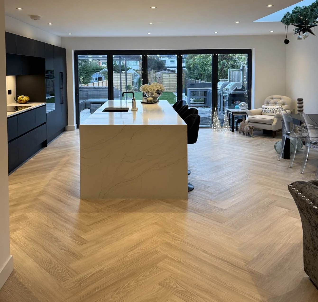 The kitchen is finished with Calacatta Gold quartz worktops, introducing warmth and movement through natural veining, while the Karndean Dutch Limed Oak herringbone flooring grounds the space and complements the extension.